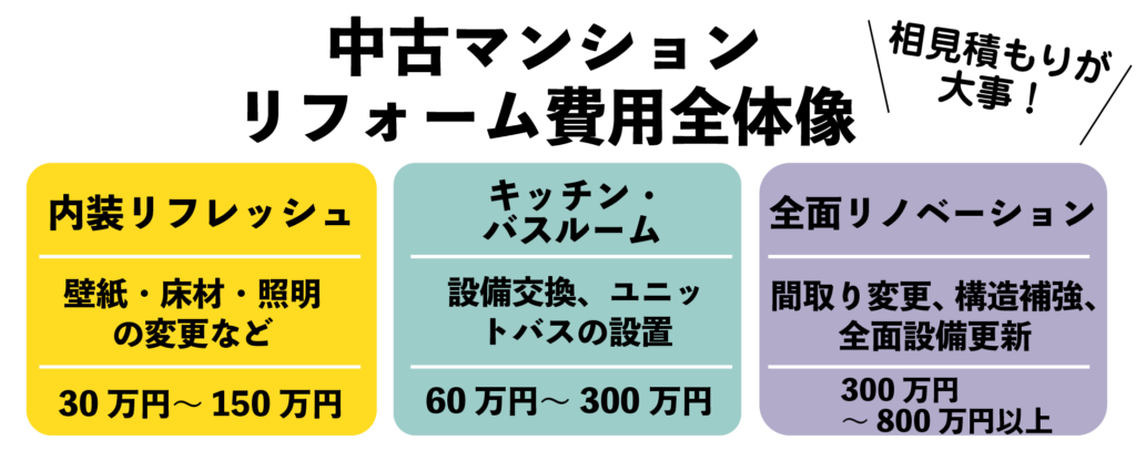 リフォーム全体の費用はどのくらい必要ですか?物件の状態や規模、希望するリフォーム内容によって異なりますが、数十万円から数百万円の幅があります。事前に複数の業者から見積もりを取り、比較することが大切です。