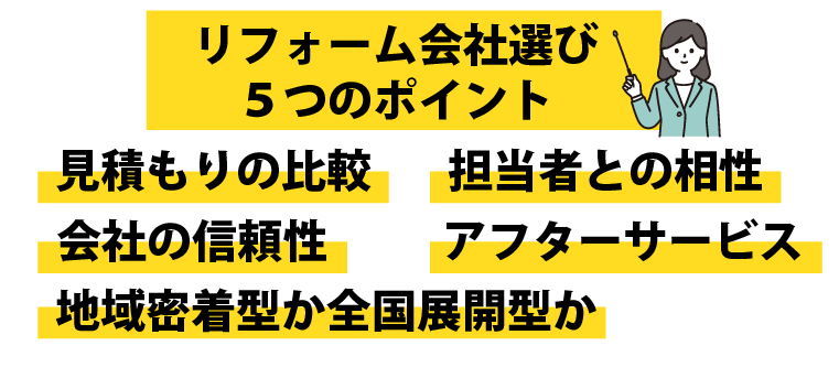 リフォーム後に「もっと低い段差にすればよかった」「滑りにくい床にしたが気に入らない様子」など、思わぬ問題が起きることがあります。そのため、リフォーム後の施工保証についてや、アフターメンテナンス、補償対象について事前にリフォーム会社に確認することが大切です。